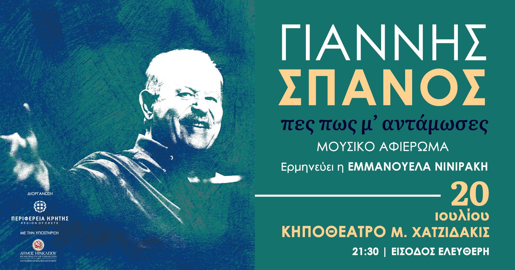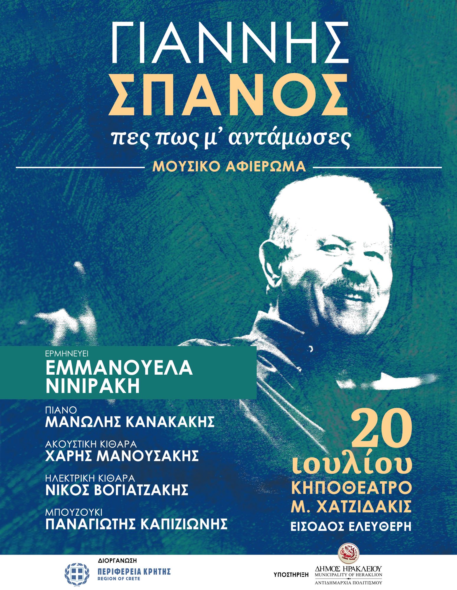 Το Σάββατο 20 Ιουλίου και ώρα 21:30 στο Κηποθέατρο “Μάνος Χατζιδάκις” θα τιμηθεί το έργο του Γιάννη Σπανού σε μια μουσική παράσταση με τίτλο “Πες πως μ’ αντάμωσες” με την στήριξη της Περιφέρειας Κρήτης και ελεύθερη είσοδο.