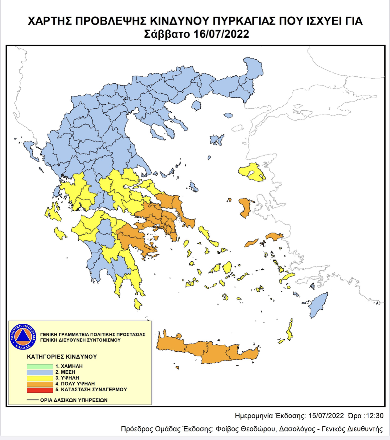 Η Πολιτική Προστασία Περιφέρειας Κρήτης ενημερώνει ότι, σύμφωνα με τον Ημερήσιο Χάρτη Πρόβλεψης Κινδύνου Πυρκαγιάς της Γενικής Γραμματείας Πολιτικής Προστασίας για αύριο Σάββατο  16 Ιουλίου 2022 η κατηγορία Κινδύνου Πυρκαγιάς για το σύνολο της Κρήτης  , είναι: 4 (πολύ υψηλός).