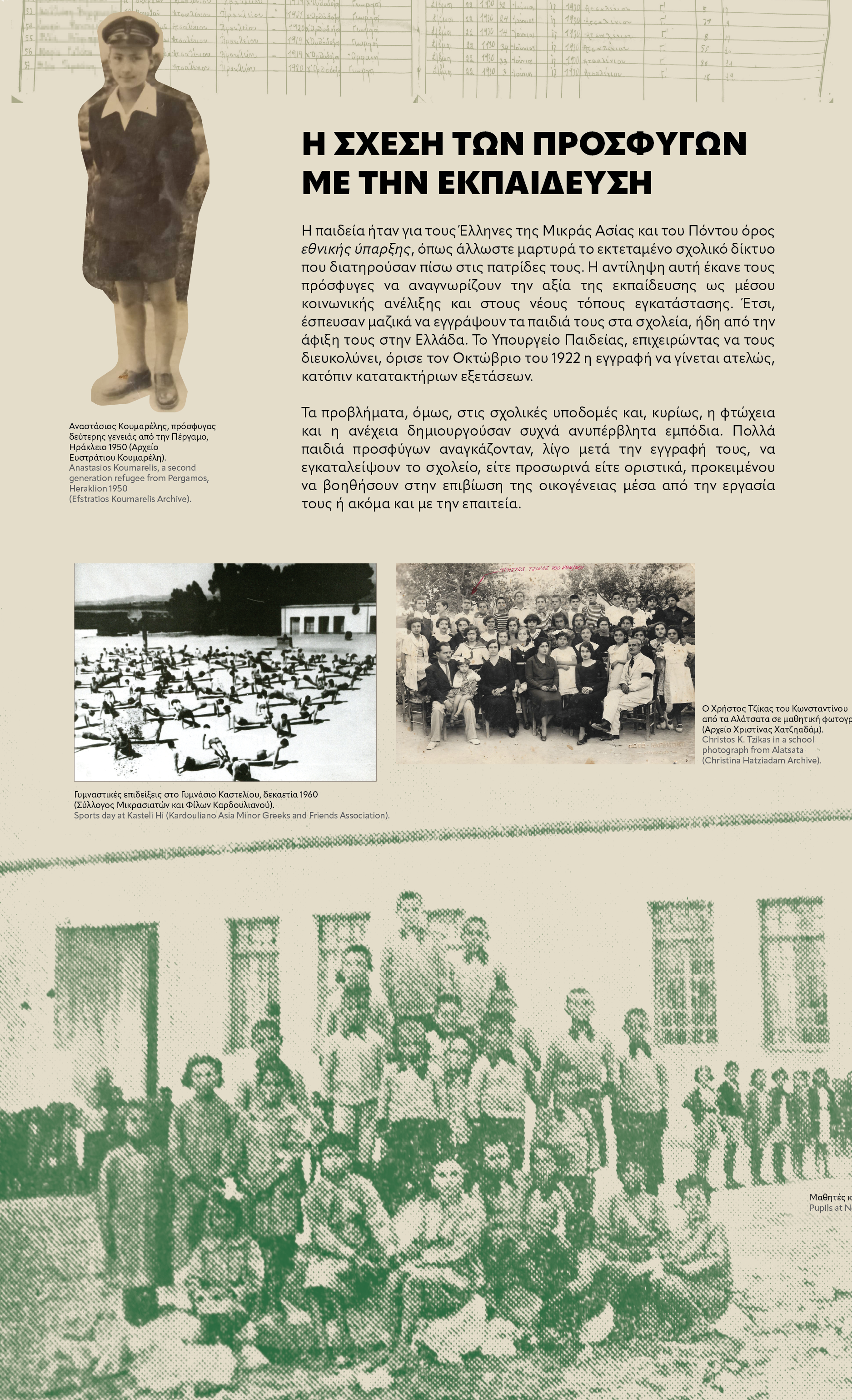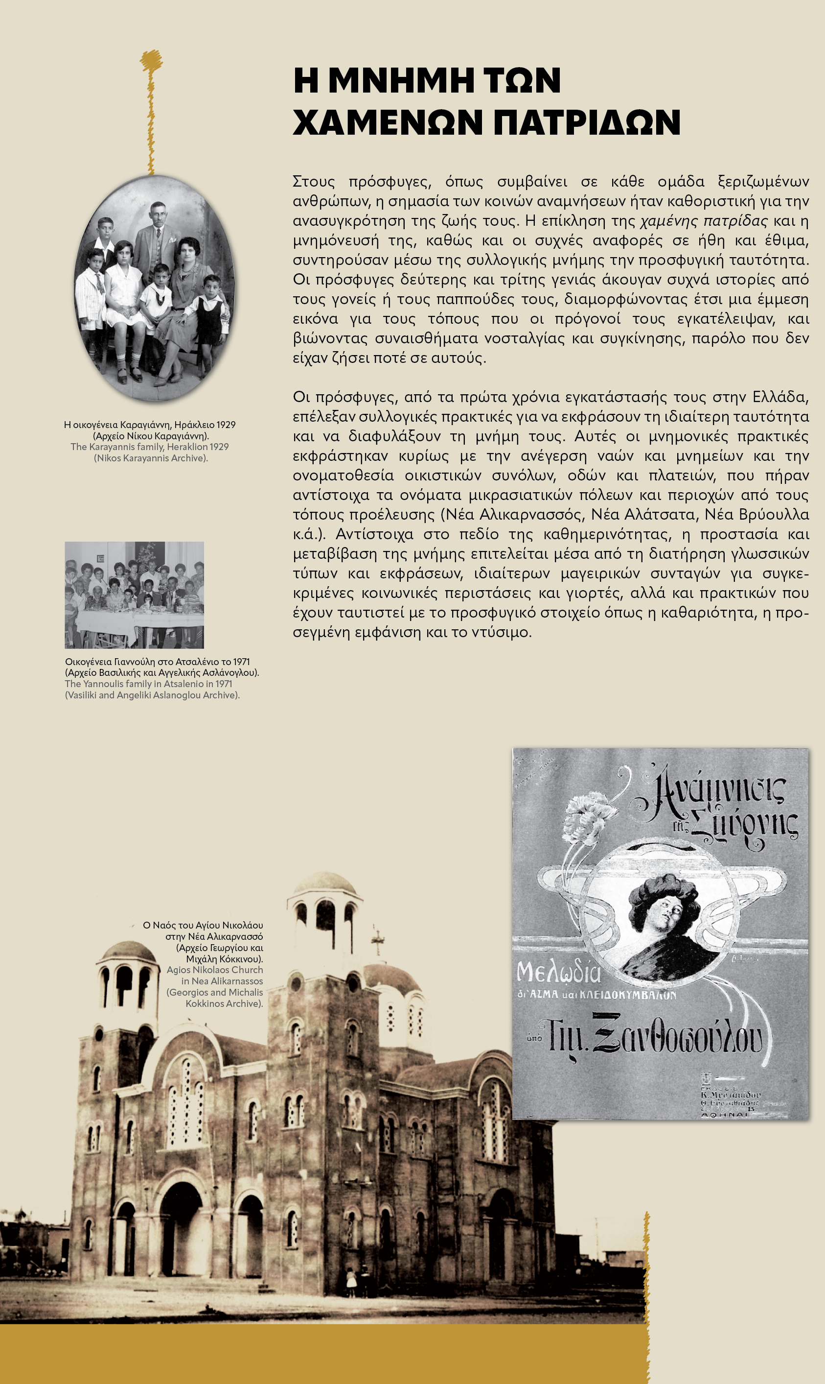 Για την τεκμηρίωση της έκθεσης αξιοποιήθηκαν αρχειακά και υλικά τεκμήρια από τις Συλλογές και τη Βιβλιοθήκη του Ιστορικού Μουσείου Κρήτης και της Βικελαίας Δημοτικής Βιβλιοθήκης. Σημαντική για την τεκμηρίωση υπήρξε η συμβολή των Συλλόγων των απογόνων των Προσφύγων: της Αδελφότητας Μικρασιατών Νομού Χανίων «Ο Άγιος Πολύκαρπος», του Συλλόγου Μικρασιατών Κρήτης «Άγιος Πολύκαρπος», του Συλλόγου Καππαδοκών-Μικρασιατών Ηρακλείου, του Συλλόγου Αλατσατιανών Νομού Ηρακλείου, του Συλλόγου Μικρασιατών και Φίλων Καρδουλιανού, του Πολιτιστικού Συλλόγου Νέας Αλικαρνασσού «Η Αρτεμισία», του Συλλόγου Καραμπουρνιωτών Ηρακλείου «Άγιος Γεώργιος», του Συλλόγου Φίλων Αγίου Νεκταρίου εκ Βρυούλων, του Πολιτιστικού Συλλόγου Αποϊνίου Μονοφατσίου «ΒΑΚΙΩΤΕΣ», του Συλλόγου Φίλων Περιβάλλοντος, της Ένωσης Σμυρναίων, του Πανελλήνιου Γυμναστικού Συλλόγου, καθώς και δεκάδων προσώπων με προσφυγική καταγωγή.