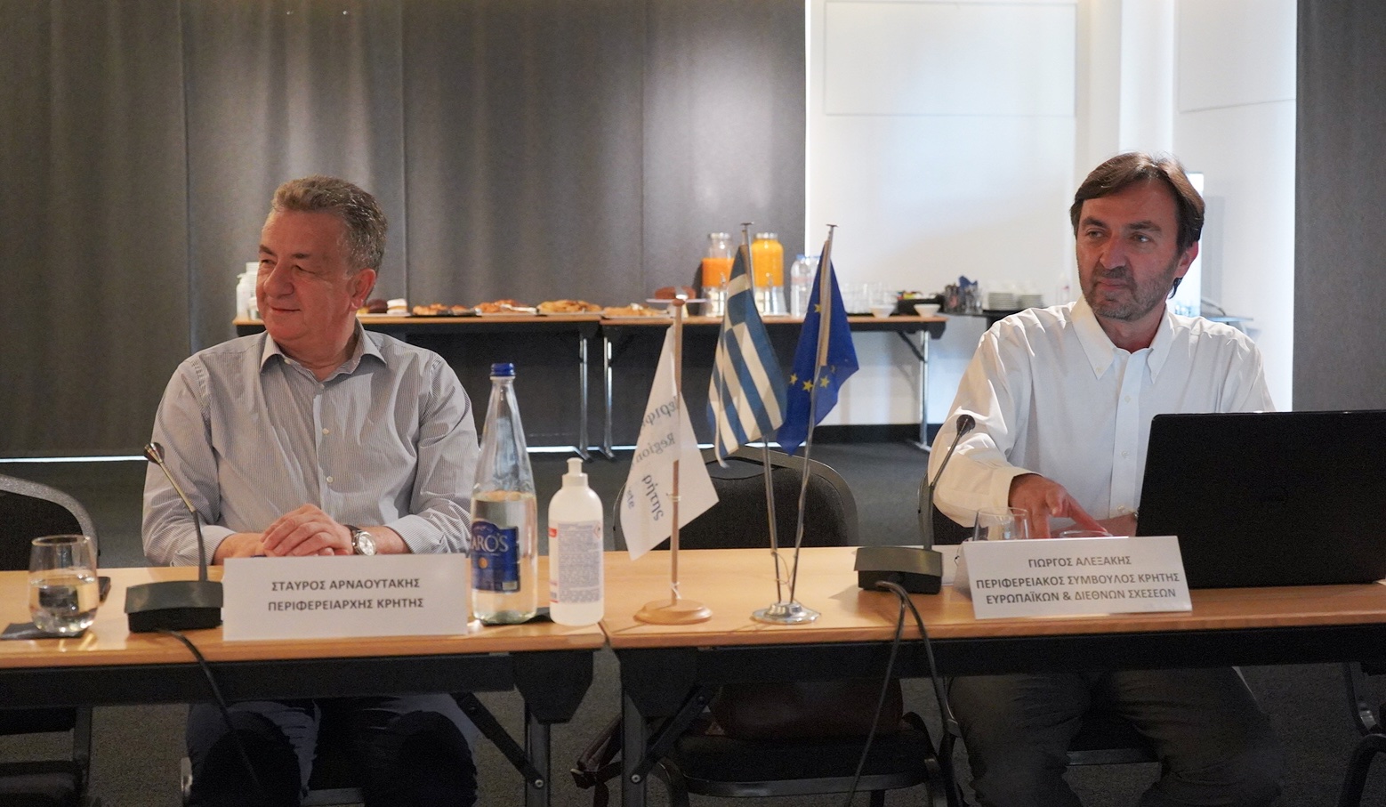 Στη συνέχεια, ο Γιώργος Αλεξάκης, Περιφερειακός Σύμβουλος Κρήτης και Εντεταλμένος Ευρωπαϊκών και Διεθνών Θεμάτων αναφέρθηκε αναλυτικά και επεξήγησε την διάσταση και το ρόλο της Κρήτης σε διάφορα Ευρωπαϊκά Δίκτυα Συνεργασίας, την διεύρυνση των δεσμών με άλλες Περιφέρειες και την αξιοποίηση των Ευρωπαϊκών Ανταγωνιστικών Προγραμμάτων. Στο πλαίσιο αυτό, η Περιφέρεια Κρήτης έχει αναπτύξει συνεργασίες με 33 χώρες και περισσότερες από 45 Ευρωπαϊκές Περιφέρειες σε θέματα όπως περιβάλλον, κλιματική αλλαγή, κυκλική οικονομία, γαλάζια ανάπτυξη κ.ά. Παράλληλα, η Περιφέρεια Κρήτης έχει δυναμική εξωστρεφή παρουσία με εκπροσώπους χωρών όπως η Ιταλία και η Κίνα που επισκέπτονται την Κρήτη διατηρώντας ισχυρούς δεσμούς. Επιπλέον, έγινε αναφορά στις δράσεις του Κέντρου Ευρωπαϊκής Πληροφόρησης της Περιφέρειας Κρήτης (Europe Direct), το οποίο παρέχει στους πολίτες πληροφορίες για ευρωπαϊκά θέματα σε τοπικό επίπεδο.