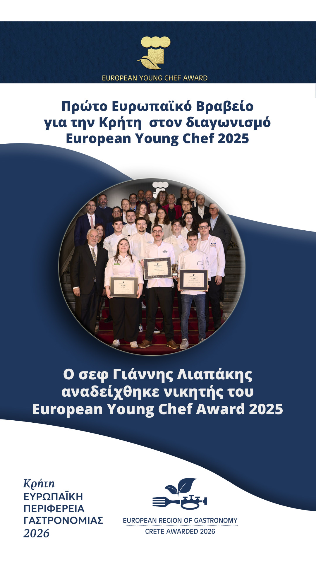 Αξιοποιώντας την παράδοση και συνδέοντάς τη με τη σύγχρονη μαγειρική τέχνη, ο Γιάννης Λιαπάκης ανέδειξε τις αξίες της κρητικής διατροφής σε διεθνές επίπεδο. Ως Περιφέρεια Κρήτης, στηρίζουμε έμπρακτα τη νέα γενιά των δημιουργών μας. Η διάκριση αυτή αποτελεί τον καλύτερο προάγγελο για το 2026, τη χρονιά που η Κρήτη θα γιορτάσει τον τίτλο της Ευρωπαϊκής Γαστρονομικής Περιφέρειας, προσκαλώντας όλη την Ευρώπη να γευτεί την αυθεντικότητα και τη φιλοξενία του τόπου μας. Θερμά συγχαρητήρια στον ταλαντούχο νικητή, στη Λέσχη Αρχιμαγείρων και σε όλους τους συντελεστές των δράσεων που αναπτύσσουμε ως Ευρωπαϊκή Γαστρονομική Περιφέρεια για το 2026».