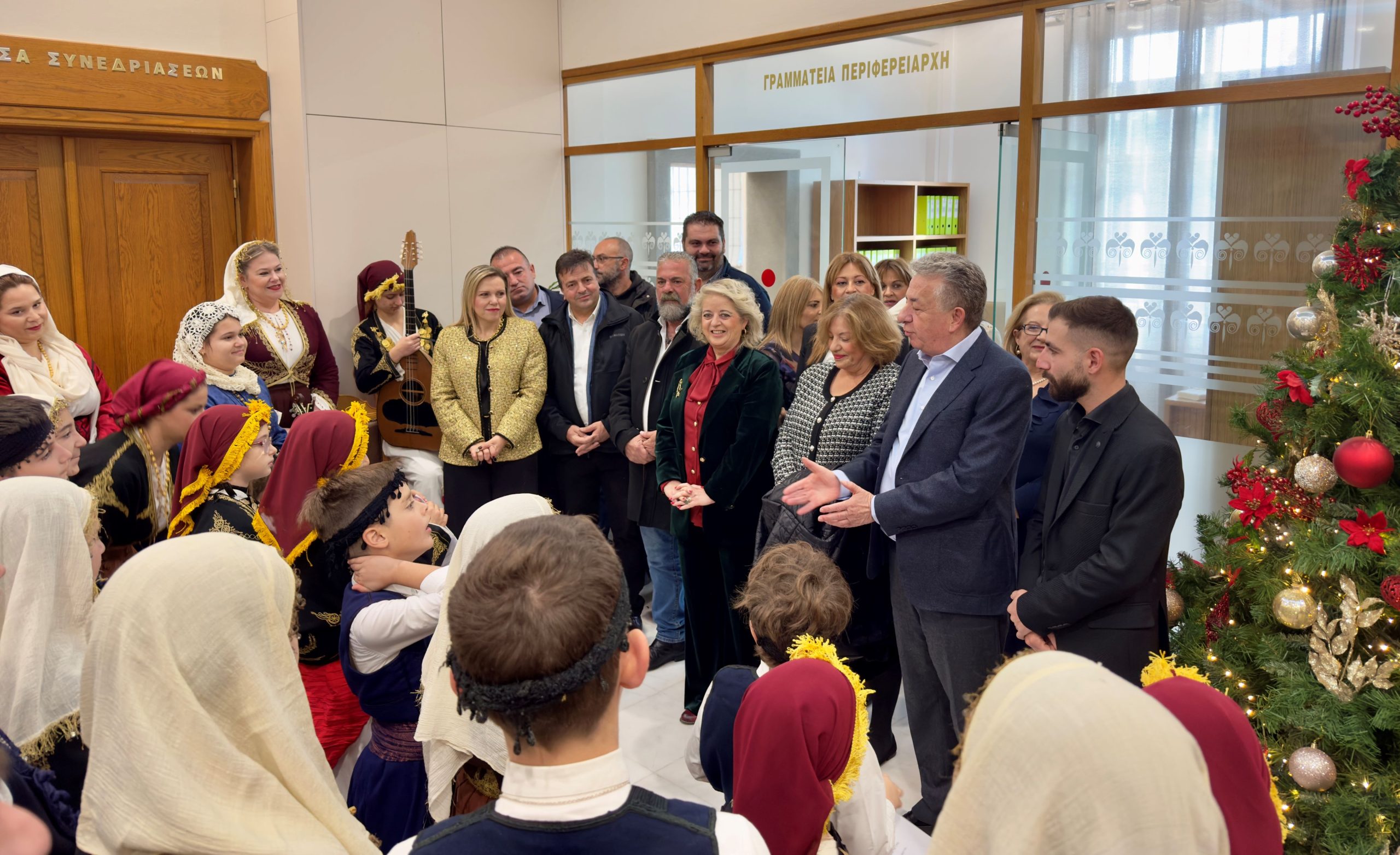 Σε εορταστικό κλίμα και με παραδοσιακά ακούσματα πλημμύρισε σήμερα, παραμονή Πρωτοχρονιάς, το κτίριο της Περιφέρειας Κρήτης. Φορείς, σύλλογοι και εκπρόσωποι των ενόπλων δυνάμεων επισκέφθηκαν τον Περιφερειάρχη Κρήτης Σταύρο Αρναουτάκη για να ψάλουν τα κάλαντα και να ανταλλάξουν ευχές για το νέο έτος.