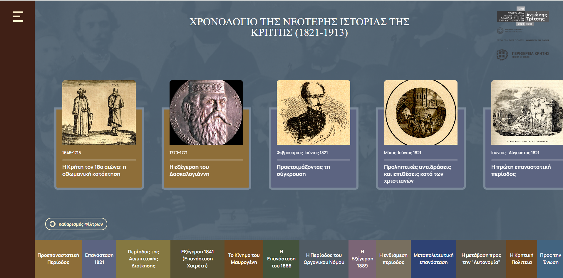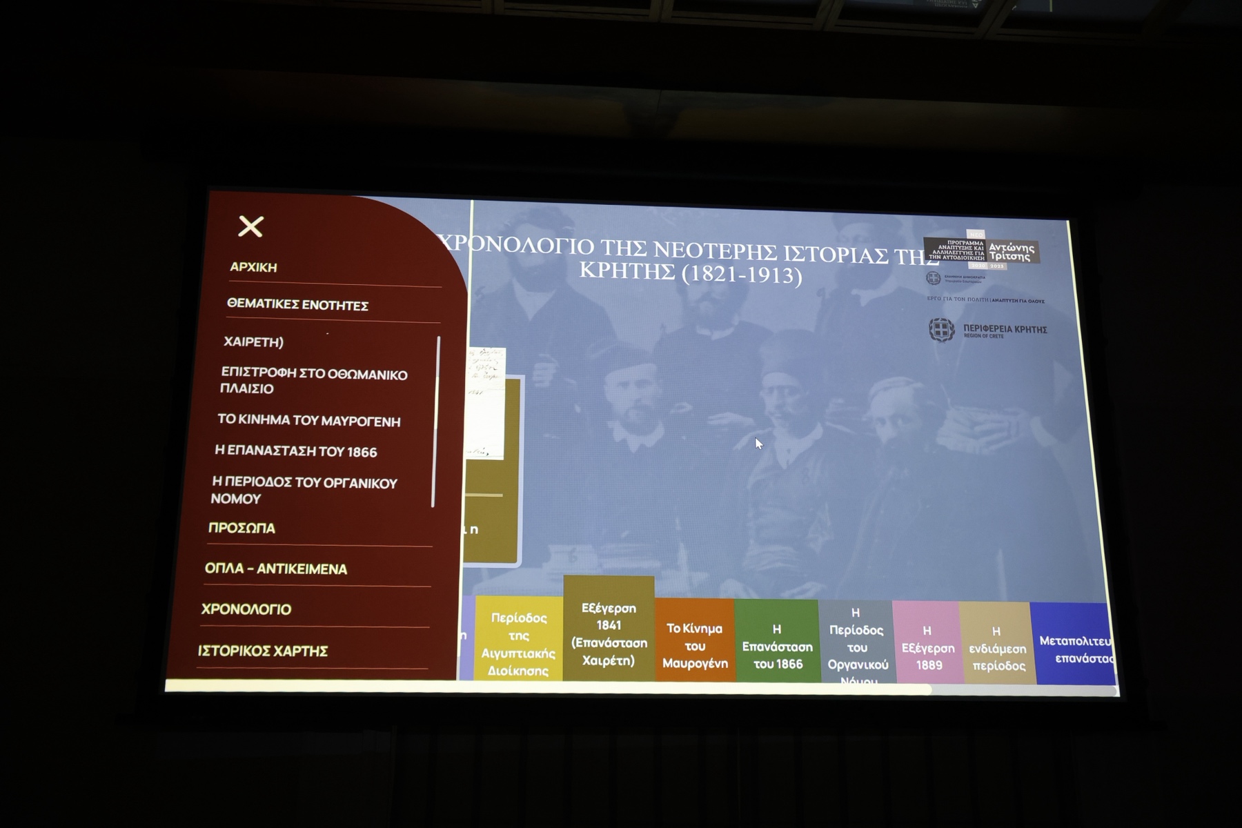 Η νέα ηλεκτρονική δικτυακή πύλη και οι ψηφιακές εφαρμογές που αναπτύχθηκαν στο πλαίσιο του έργου «Ψηφιακός Ιστορικός Πλοηγός της Νεότερης Ιστορίας της Κρήτης (1821–1913)», παρουσιάστηκε σήμερα στο πλαίσιο συνέντευξης τύπου στην Περιφέρεια Κρήτης. Το έργο υλοποιήθηκε μέσω του προγράμματος «ΑΝΤΩΝΗΣ ΤΡΙΤΣΗΣ» του Υπουργείου Εσωτερικών, με δικαιούχο την Περιφέρεια Κρήτης, σε επιστημονική επιμέλεια του Ιστορικού Μουσείου Κρήτης (ΕΚΙΜ/ΙΜΚ) και την ανάδοχο Ένωση Εταιρειών «NOVA ICT – ΑΙΓΑΙΟΥ SOLUTIONS».