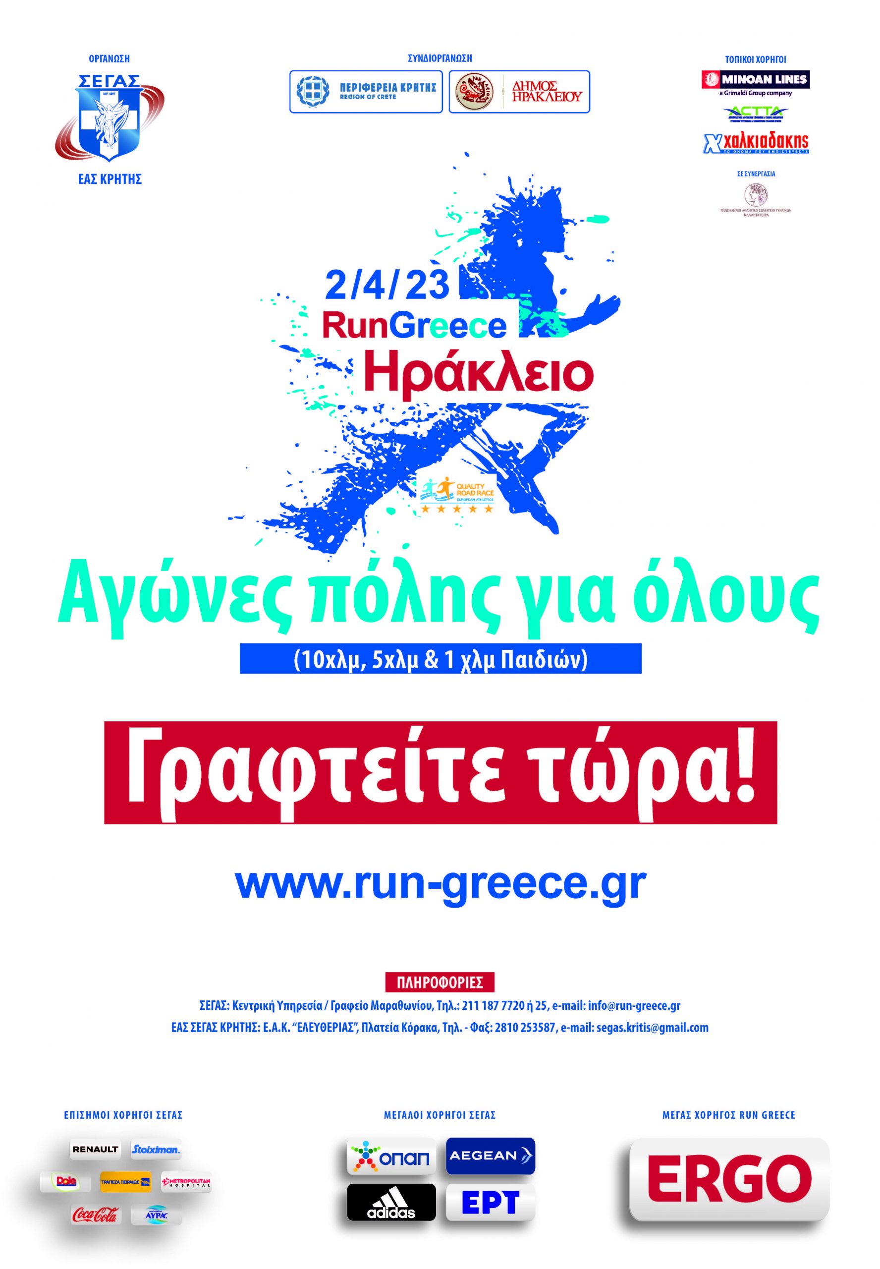 Το Ηράκλειο και το Run Greece, που διοργανώνει ο Σ.Ε.Γ.Α.Σ. – Ε.Α.Σ. Σ.Ε.ΓΑ.Σ. Κρήτης με συνδιοργανωτές την Περιφέρεια Κρήτης και το Δήμο Ηρακλείου, μεγάλο χορηγό την ERGO Ασφαλιστική και τοπικούς χορηγούς τις Μινωικές Γραμμές, το Σύνδεσμο Τουριστικών και Ταξιδιωτικών Γραφείων Κρήτης, τα Super Market Χαλκιαδάκης και με τη συνεργασία του πανελλήνιου αθλητικού σωματείου Γυναικών «Καλλιπάτειρα», είναι έτοιμο να υποδεχτεί τους εκατοντάδες δρομείς από όλη την Κρήτη, αφού οι μέχρι σήμερα εγγραφές ξεπέρασαν ήδη τις 2.600 και αναμένεται μέχρι και το Σάββατο να έχουν εξαντληθεί οι διαθέσιμες θέσεις εγγραφής και συμμετοχής.