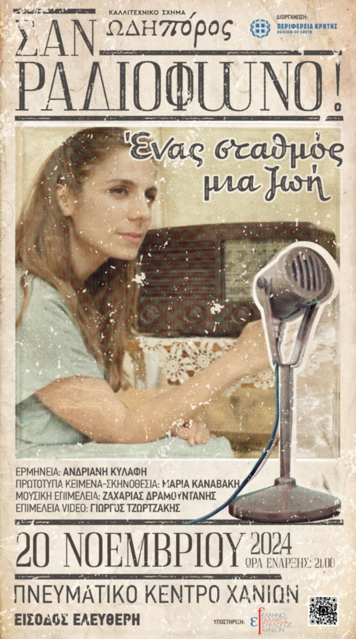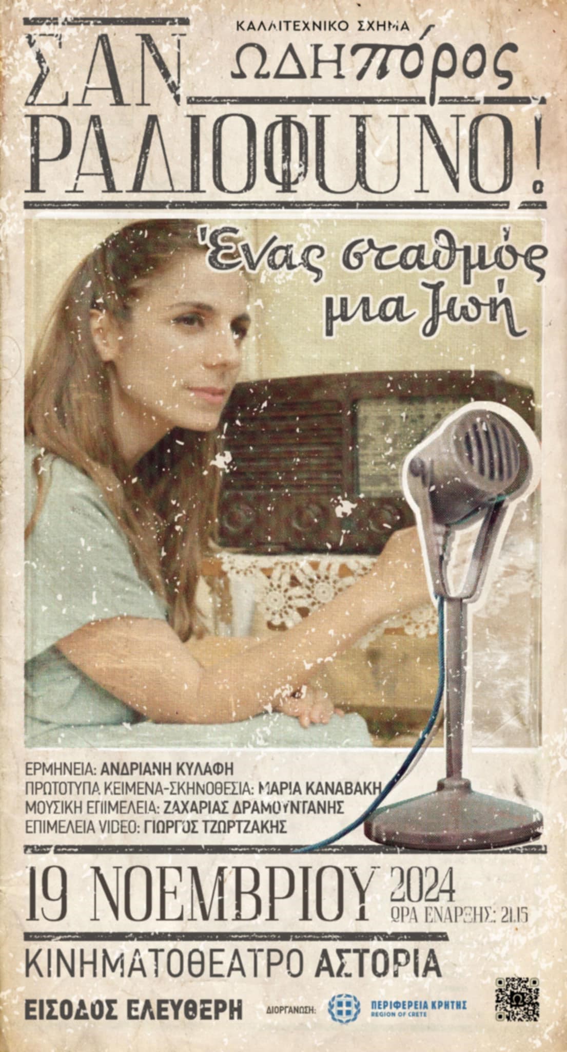 Το καλλιτεχνικό σχήμα «ΩΔΗΠΟΡΟΣ» και η Περιφέρεια Κρήτης διοργανώνουν τη μουσικοθεατρική παράσταση «Σαν ραδιόφωνο….Ένας σταθμός, μια ζωή» σε Ηράκλειο και Χανιά.