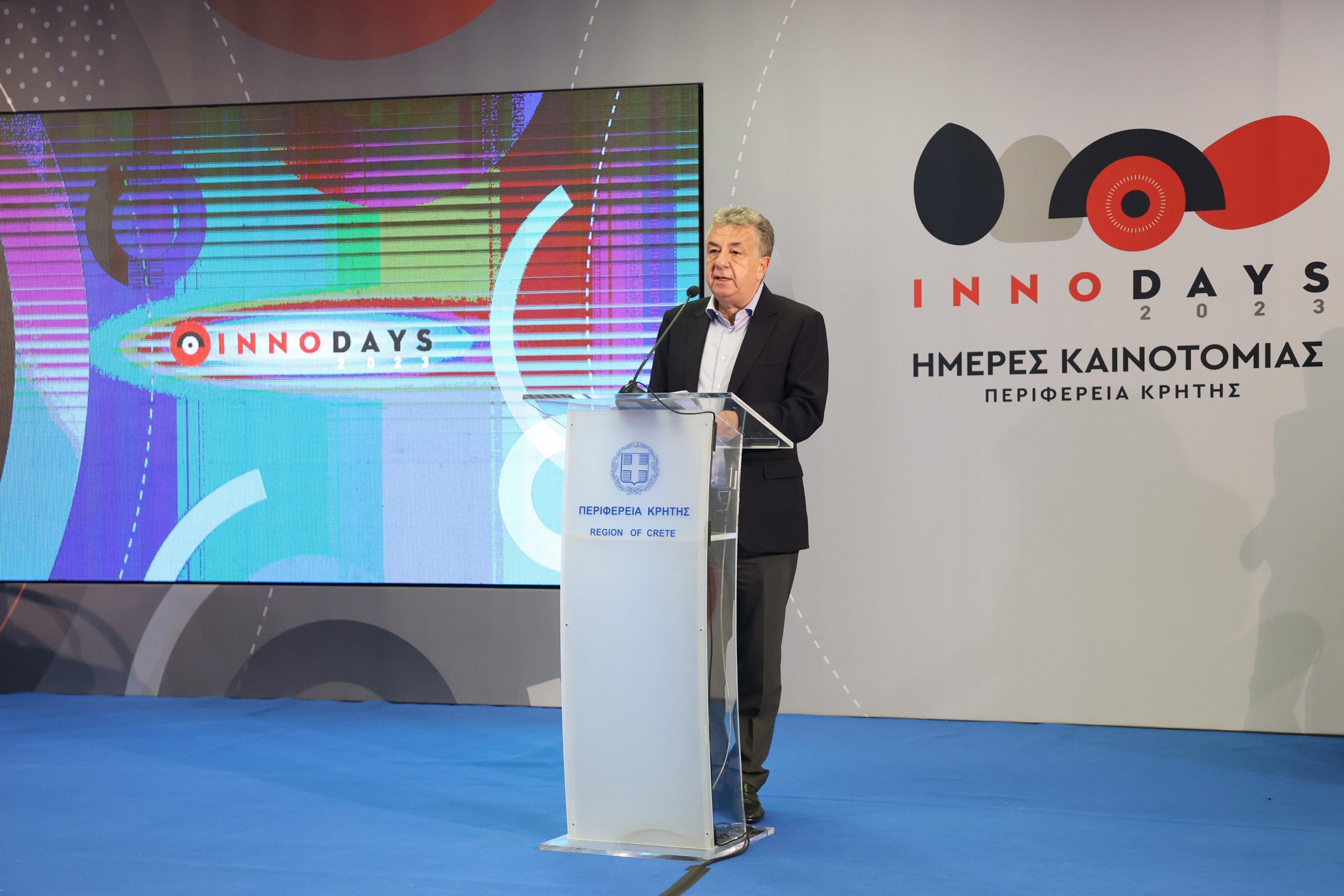 Με την επίσημη τελετή των εγκαινίων ξεκίνησε το τριήμερο καινοτομίας «InnoDays 2023: «Ημέρες Καινοτομίας 2023 – Η Κρήτη της Γνώσης και της Παραγωγής», που διοργανώνει η Περιφέρεια Κρήτης για δεύτερη χρονιά στο Διεθνές Εκθεσιακό Κέντρο Κρήτης (Γούβες, Ηρακλείου) μέχρι και την Κυριακή 26 Νοεμβρίου.