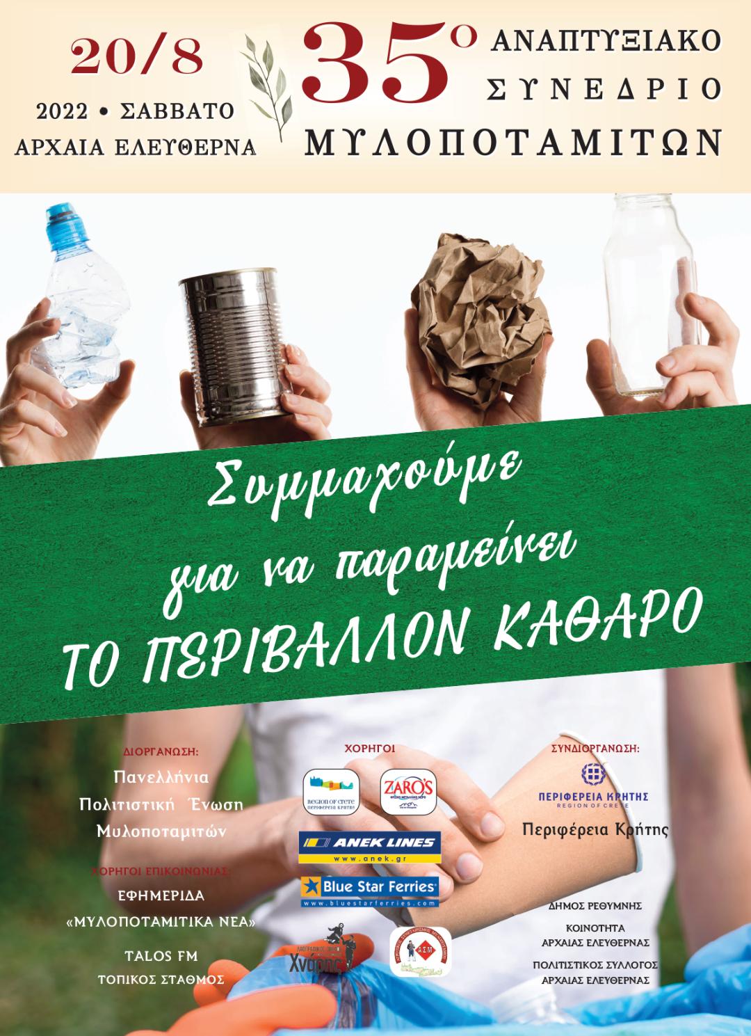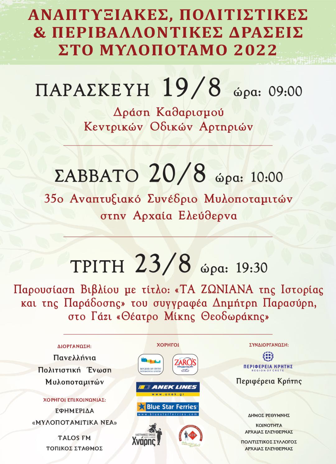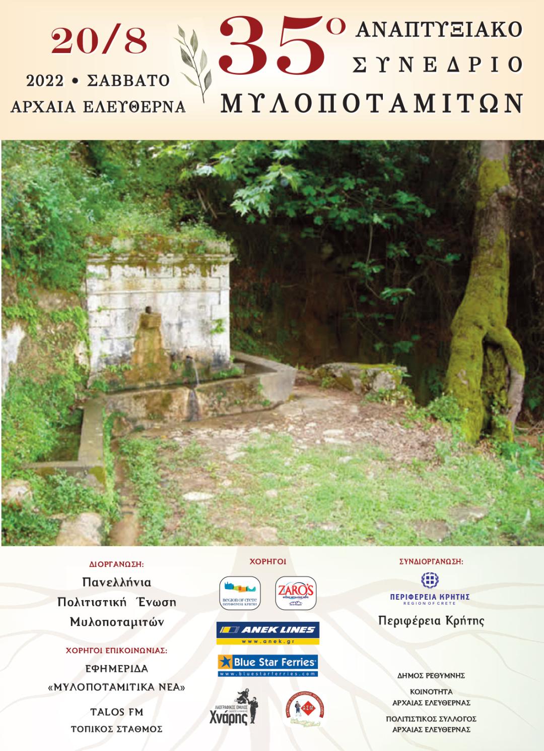 Η «Πανελλήνια Πολιτιστική Ένωση Μυλοποταμιτών», με τη στήριξη της Περιφέρειας Κρήτης, πραγματοποιεί το 35ο Αναπτυξιακό Συνέδριο Μυλοποταμιτών, το Σάββατο 20 Αυγούστου 2022 και ώρα 10:00, στο χωριό Αρχαία Ελεύθερνα (Χώρος Δασικής Αναψυχής «Δάμακας»), του Δήμου Ρεθύμνης. Στη υλοποίηση του Συνεδρίου συμβάλλουν επίσης, ο Δήμος Ρεθύμνης, η Κοινότητα Αρχαίας Ελεύθερνας και ο Πολιτιστικός Σύλλογος Αρχαίας Ελεύθερνας.