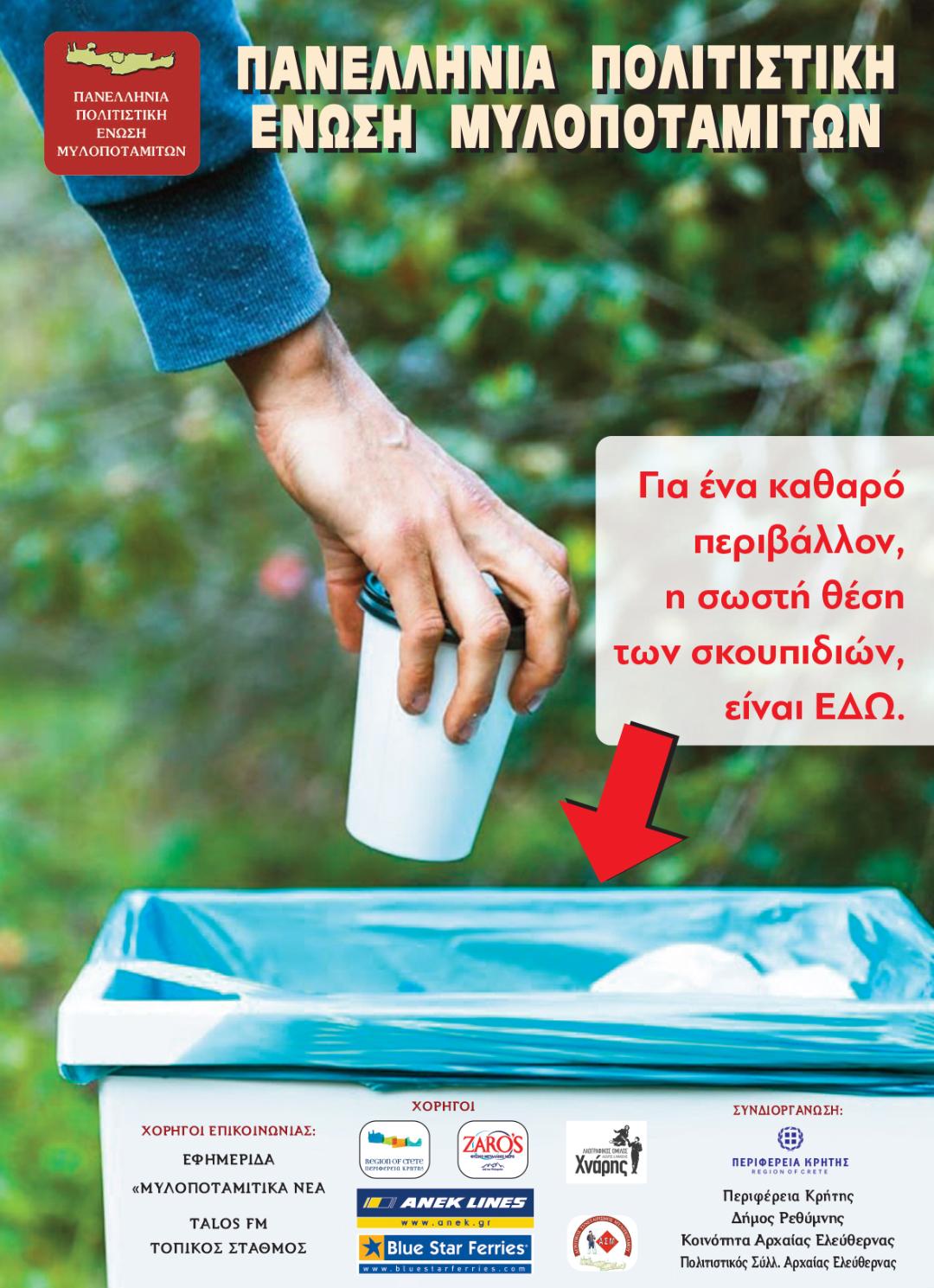 Στο πλαίσιο των πρωτοβουλιών της Πανελλήνιας Πολιτιστικής Ένωσης Μυλοποταμιτών θα πραγματοποιηθούν την Παρασκευή 19 Αυγούστου δράσεις καθαρισμού κεντρικών οδικών αρτηριών. Παράλληλα έχει οργανωθεί ειδική καμπάνια με στόχο την ενθάρρυνσή –προτροπή όσων ρυπαίνουν τις οδικές αρτηρίες και όχι μόνο, να «αξιοποιούν» τους κάδους απορριμμάτων! Για το σκοπό αυτό έχει εκδοθεί ειδική αφίσα που θα τοποθετηθεί σε καφέ και άλλα σημεία της περιοχής.