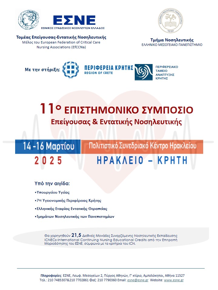 Ο Τομέας Επείγουσας – Εντατικής Νοσηλευτικής (ΤΕΕΝ) του Εθνικού Συνδέσμου Νοσηλευτών Ελλάδος (ΕΣΝΕ) και το Τμήμα Νοσηλευτικής του Ελληνικού Μεσογειακού Πανεπιστημίου (ΕΛ.ΜΕ.ΠΑ.) με τη στήριξη της Περιφέρειας Κρήτης συνδιοργανώνουν το 11o Επιστημονικό Συμπόσιο Επείγουσας & Εντατικής Νοσηλευτικής που θα πραγματοποιηθεί από 14 έως 16 Μαρτίου 2025, στο Πολιτιστικό Συνεδριακό Κέντρο Ηρακλείου.
