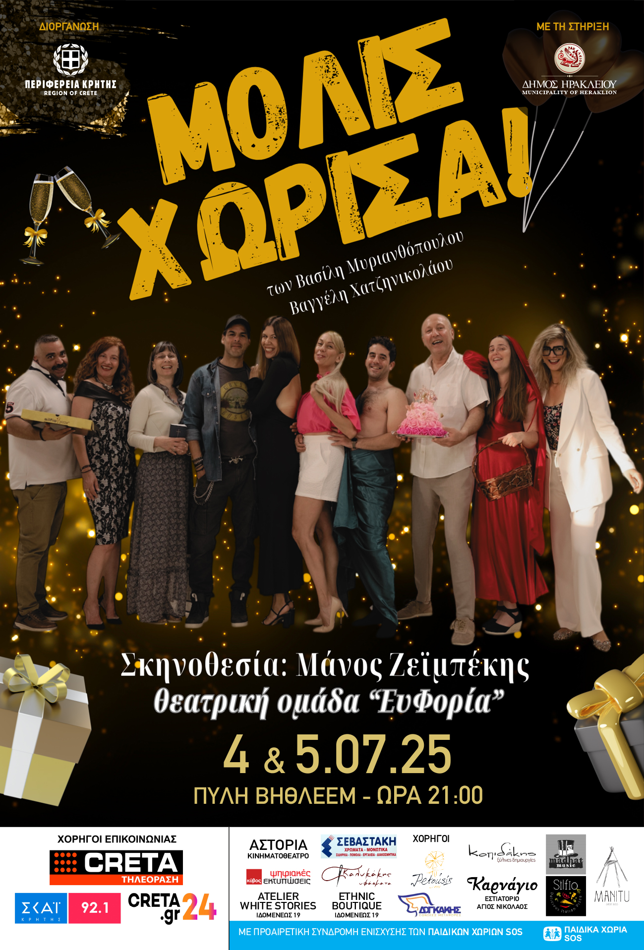 Σύλλογος εργαζομένων ΔΟY Ανατολικής Κρήτης- Θεατρική ομάδα ΕυΦΟΡΙΑ: Θεατρική παράσταση «Μόλις χώρισα» με την στήριξη της Περιφέρειας Κρήτης