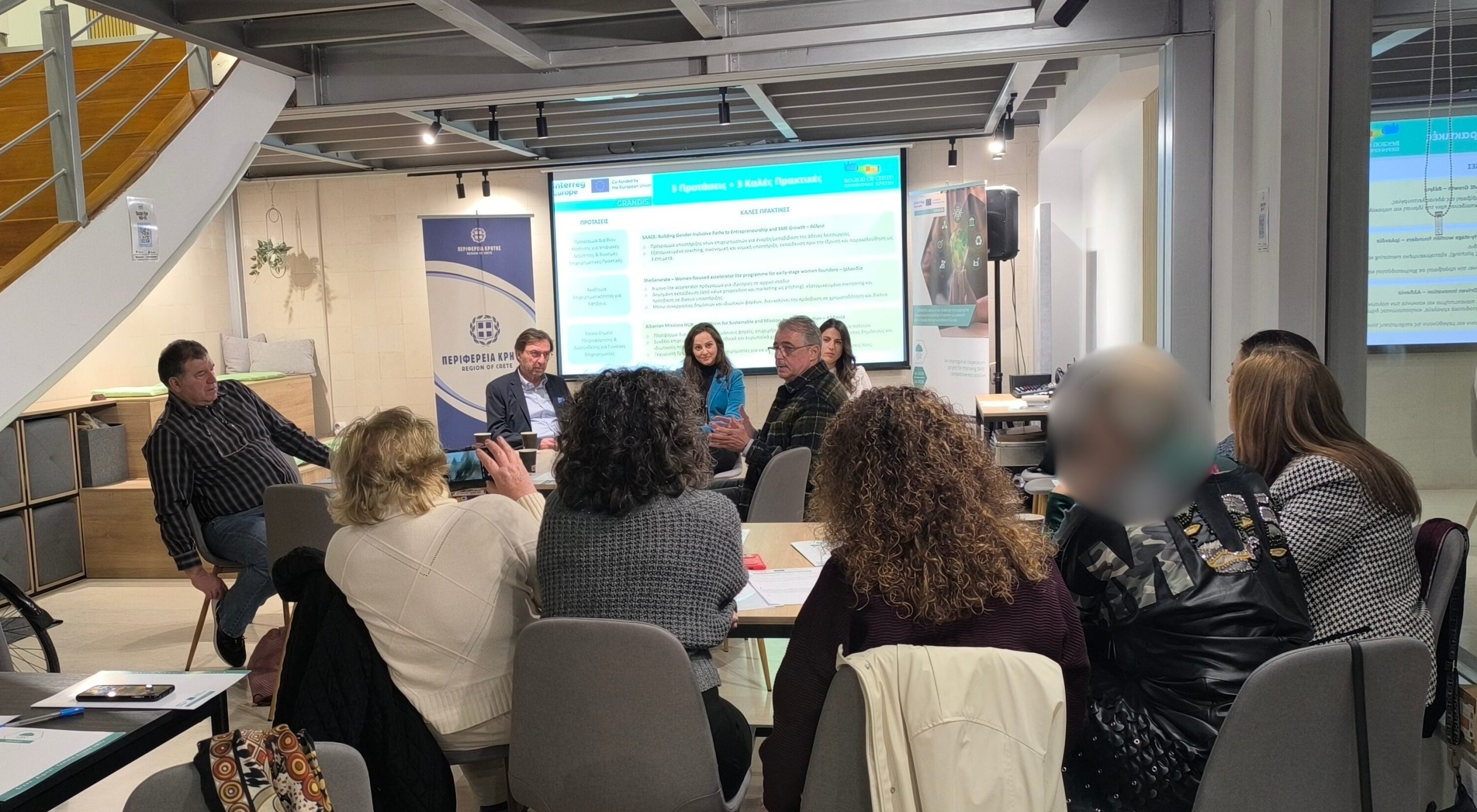 Με επιτυχία πραγματοποιήθηκε το 4ο Συμμετοχικό Εργαστήριο που διοργάνωσε η Περιφέρεια Κρήτης στο πλαίσιο του ευρωπαϊκού έργου GRANDIS (Green, Digital, Female-Driven SMEs), με συγχρηματοδότηση από το Interreg Europe. Η δράση φιλοξενήθηκε στον πολυχώρο Bizrupt στο Ηράκλειο και επικεντρώθηκε στη διαμόρφωση συγκεκριμένων προτάσεων πολιτικής για την ενίσχυση της γυναικείας επιχειρηματικότητας, αξιοποιώντας ευρωπαϊκές καλές πρακτικές προσαρμοσμένες στο τοπικό οικοσύστημα.