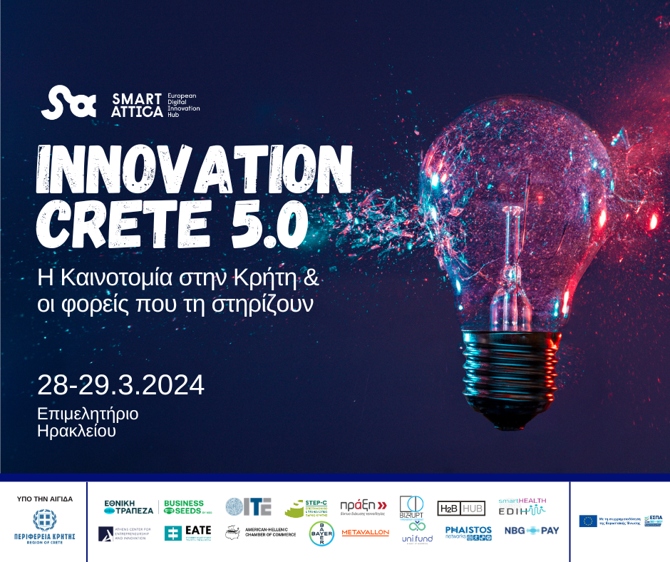 Δύο μεγάλες διοργανώσεις για την Καινοτομία, υπό την Αιγίδα της Περιφέρειας Κρήτης, θα διεξαχθούν την Πέμπτη 28 και την Παρασκευή 29 Μαρτίου 2024, στο Ηράκλειο Κρήτης, στο Επιμελητήριο Ηρακλείου και στο Ίδρυμα Τεχνολογίας και Έρευνας (ΙΤΕ).