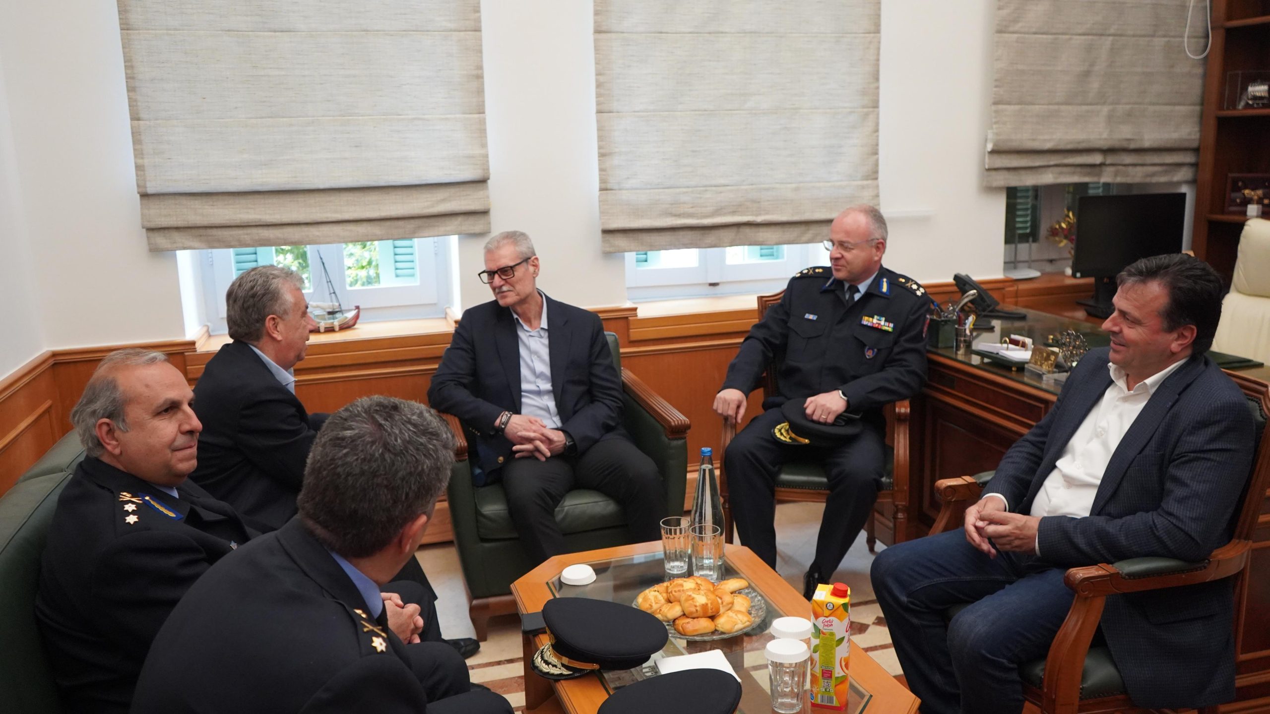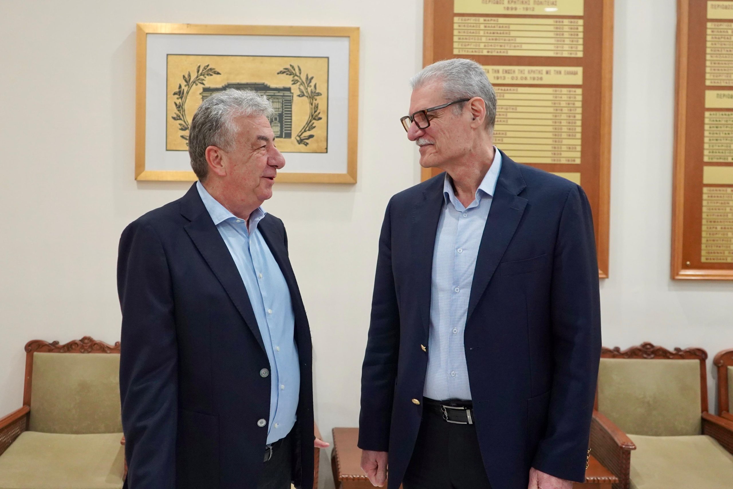 Η ημέρα ξεκίνησε με συνάντηση του Υπουργού με τον Περιφερειάρχη Κρήτης Σταύρο Αρναουτάκη στο γραφείο του στην Περιφέρεια. Κατά τη διάρκεια της συνάντησης, συζητήθηκαν θέματα που αφορούν τη θωράκιση του νησιού, την ενίσχυση των μέσων πυρόσβεσης και τη στενή συνεργασία μεταξύ της κεντρικής διοίκησης και της Τοπικής Αυτοδιοίκησης για την αντιμετώπιση των προκλήσεων της κλιματικής κρίσης.
