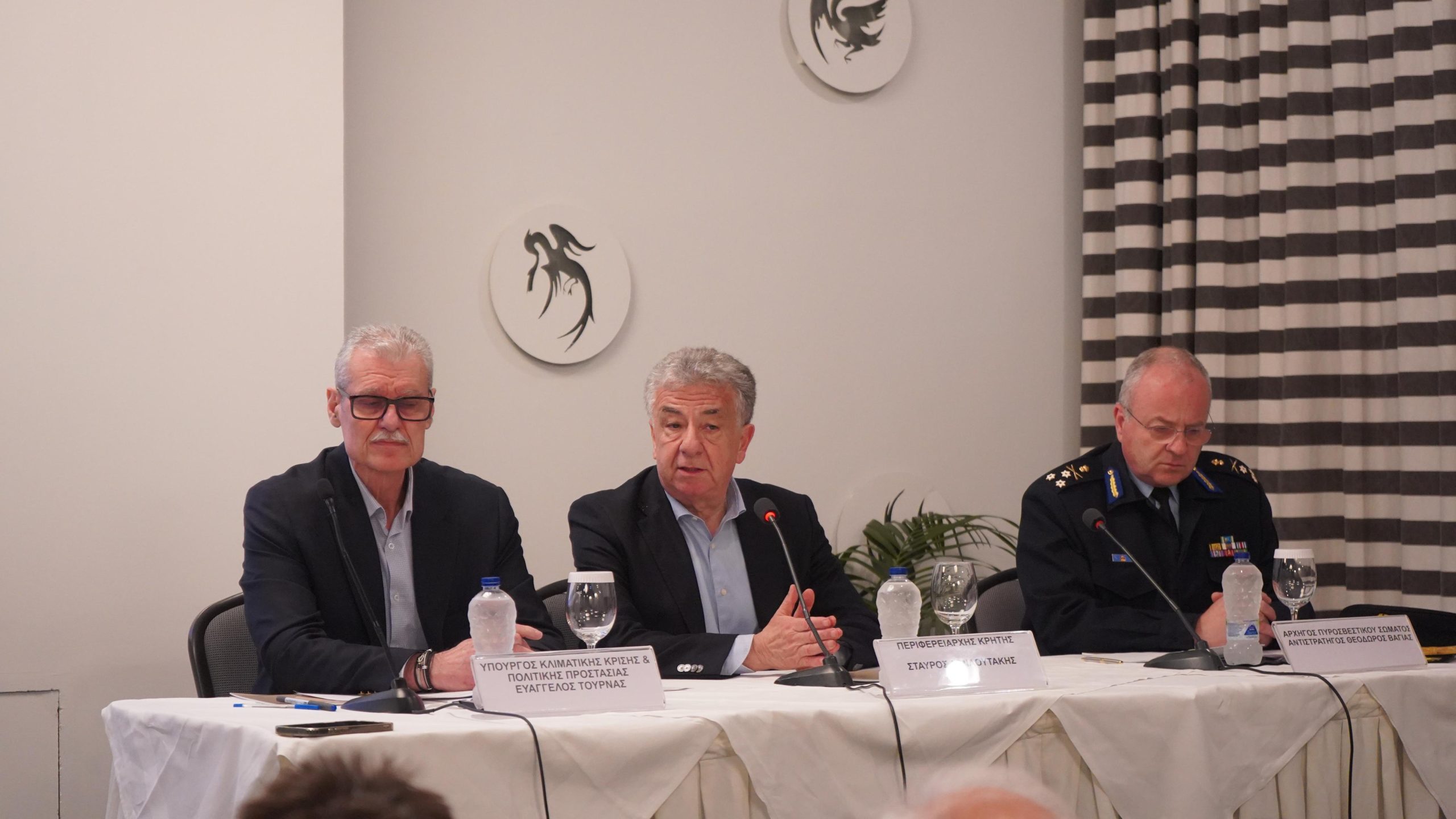 Στις δηλώσεις του πριν από την έναρξη της σύσκεψης, ο Υπουργός Κλιματικής Κρίσης και Πολιτικής Προστασίας Ευάγγελος Τουρνάς υπογράμμισε τη σημασία της πρόληψης και του έγκαιρου συντονισμού, επισημαίνοντας ότι η ετοιμότητα του μηχανισμού είναι το κλειδί για την προστασία της ανθρώπινης ζωής, της περιουσίας και του φυσικού περιβάλλοντος της Κρήτης.