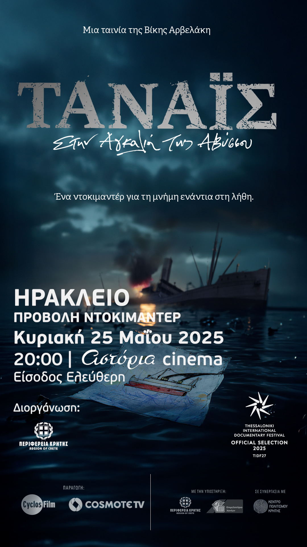 Μετά από την συγκινητική πρεμιέρα στο 27ο Φεστιβάλ Ντοκιμαντέρ Θεσσαλονίκης, όπου το ντοκιμαντέρ «Τάναϊς: Στην Αγκαλιά της Αβύσσου» ήταν υποψήφιο για το βραβείο FIPRESCI, το ιστορικό ντοκιμαντέρ σε σκηνοθεσία της Βίκης Αρβελάκη, ήρθε στην Κρήτη.