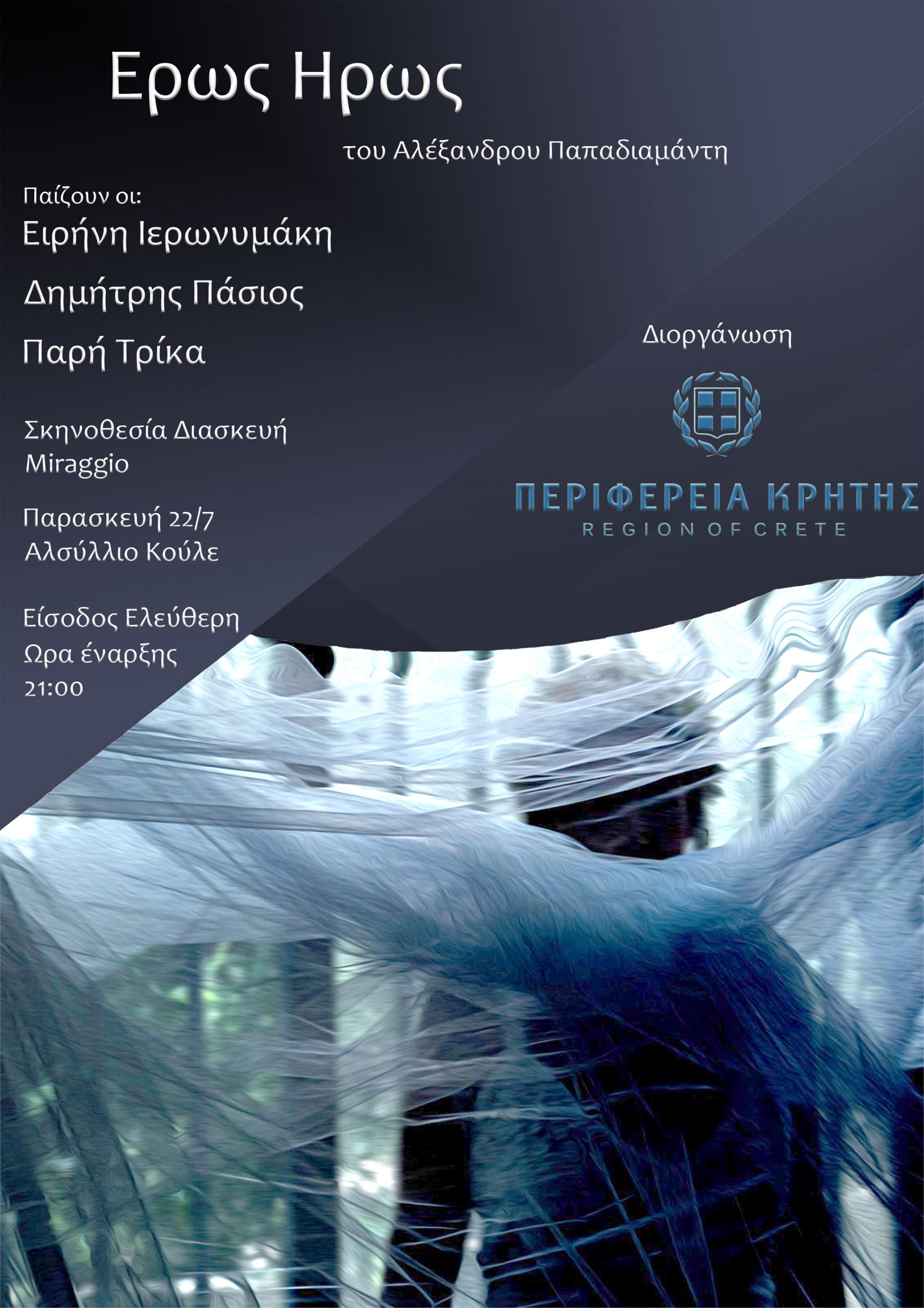 Η παράσταση θα πραγματοποιηθεί με την στήριξη της Περιφέρειας Κρήτης στο αλσύλλιο Κούλε στις Μοίρες Ηρακλείου στις 22/07/2022 και ώρα 21:00.