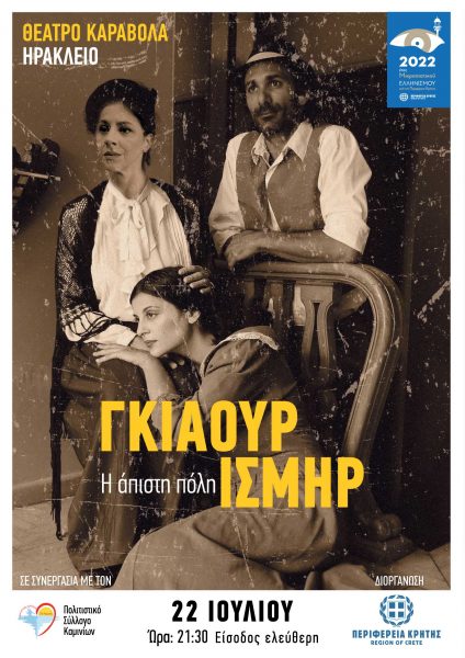 Η εταιρία παραγωγής dictum factum σε συνεργασία με τον πολιτιστικό οργανισμό Νέας Σμύρνης παρουσιάζουν τη θεατρική παράσταση «Γκιαούρ Ισμίρ» με την στήριξη της Περιφέρειας Κρήτης.