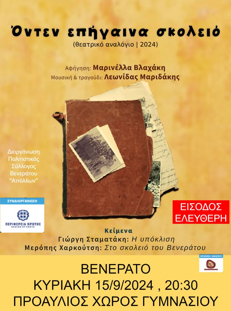 Θεατρική παράσταση «Όντεν επήγαινα σκολειό» με τη στήριξη της Περιφέρειας Κρήτης.