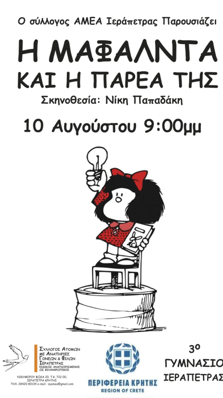 Ο Σύλλογος «Ατόμων με Αναπηρίες Γονέων και Φίλων Ιεράπετρας Γεώργιος Σουργιαδάκης» διοργανώνει με την στήριξη της Περιφέρειας Κρήτης-Π.Ε. Λασιθίου την θεατρική παράσταση «Η Μαφάλντα και η παρέα της» που θα πραγματοποιηθεί το Σάββατο 10 Αυγούστου ώρα 21:00 στο 3ο Γυμνάσιο Ιεράπετρας με ελεύθερη είσοδο.