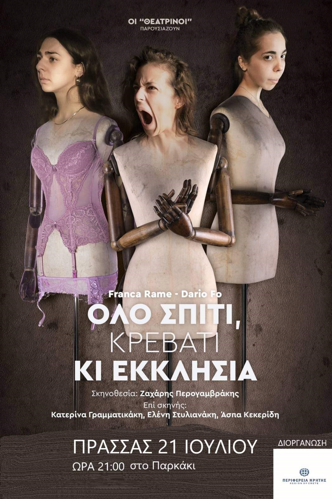 Σήμερα Παρασκευή 21 Ιουλίου 2023 ώρα 21.00, στο παρκάκι στον Πρασσά Ηρακλείου, οι «Θεατρίνοι» θα παρουσιάσουν τη θεατρική παράσταση «όλο σπίτι, κρεβάτι και εκκλησία» των Ντάριο Φο και Φράνκα Ράμε, σε σκηνοθεσία Ζαχάρη Περογαμβράκη. Η θεατρική παράσταση πραγματοποιείται με την στήριξη της Περιφέρειας Κρήτης και ελεύθερη είσοδος για τους πολίτες.