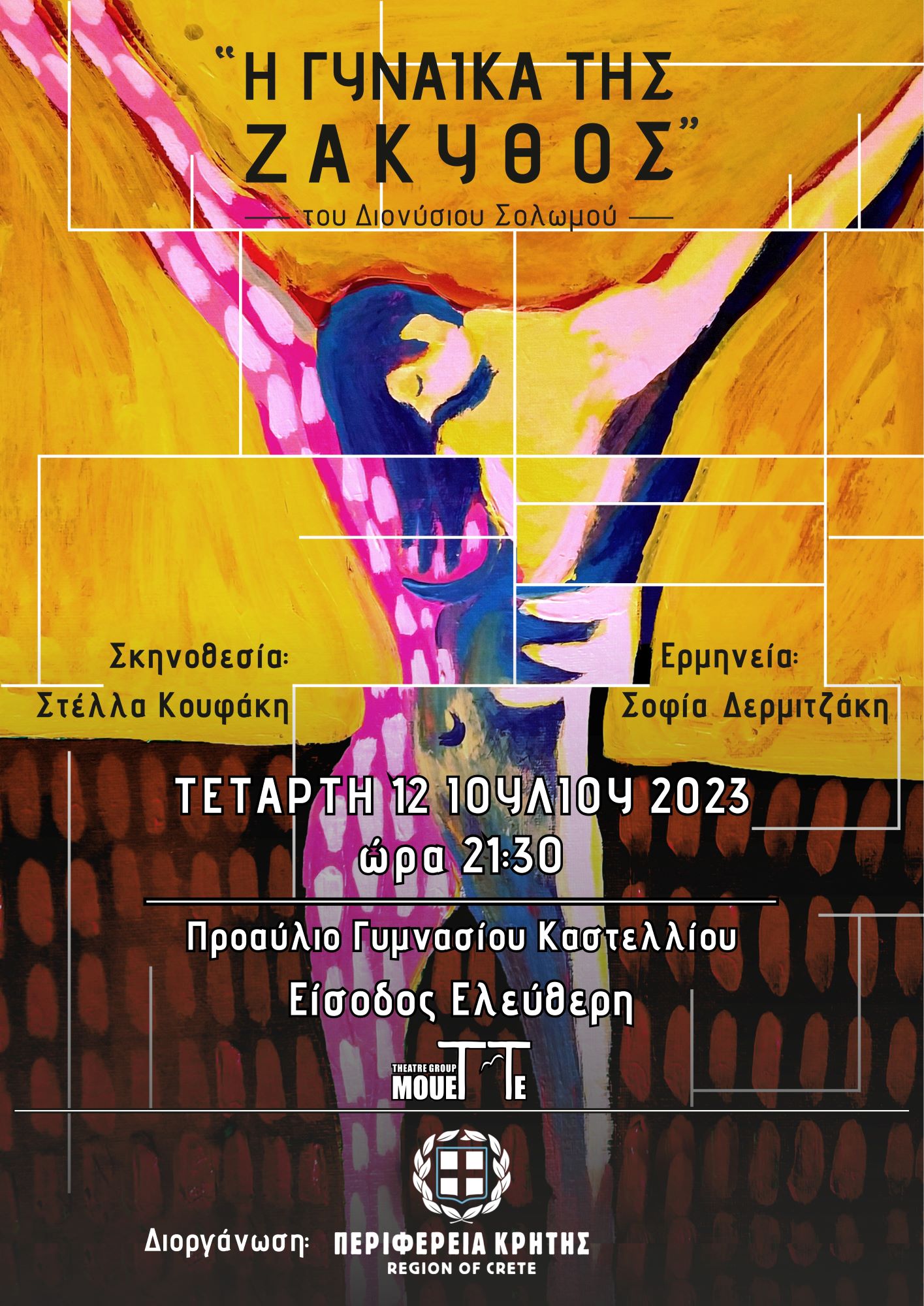 Την Τετάρτη 12 ΙΟΥΛΙΟΥ 2023 και ώρα 9.00 μ.μ., στο προαύλιο του Γυμνασίου Καστελίου θα παρουσιαστεί το έργο με τίτλο : «Η Γυναίκα της Ζάκυθος» του Διονύσιου Σολωμού.