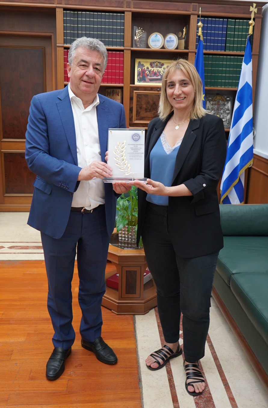 Τιμητική πλακέτα για την προσφορά του στον αθλητισμό και ειδικά στο άθλημα της πάλης, παρέδωσε σήμερα στον Περιφερειάρχη Κρήτης Σταύρο Αρναουτάκη, η Αναπληρώτρια Γραμματέας της Ελληνικής Ομοσπονδίας Πάλης Αντωνία Παπαδάκη.