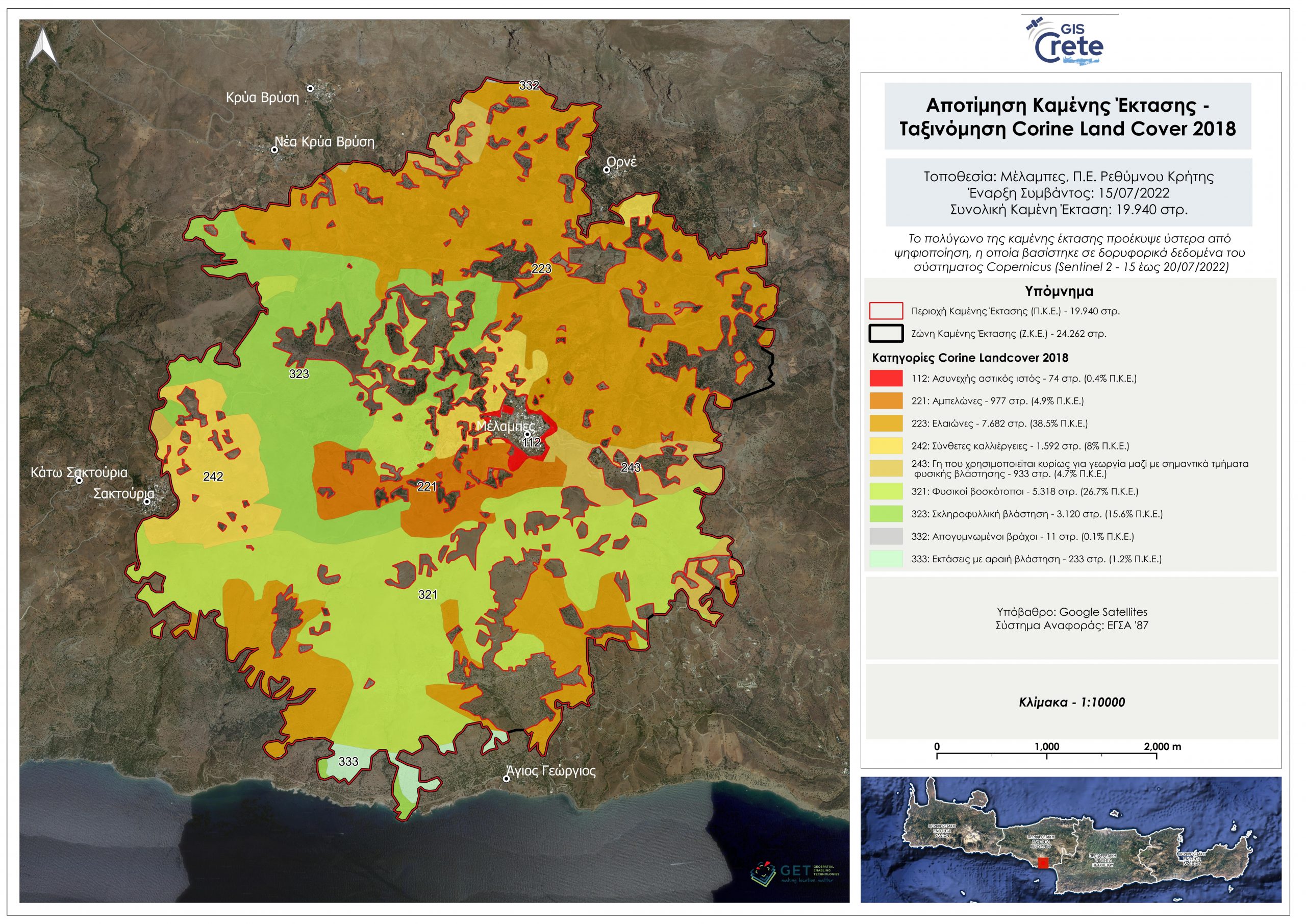 Συγκεκριμένα η χρονική μεταβολή της καμένης έκτασης του Ιουλίου 2022, βρίσκεται στον ελεύθερα προσβάσιμο χάρτη Sentinel Monitoring (crete.gov.gr)