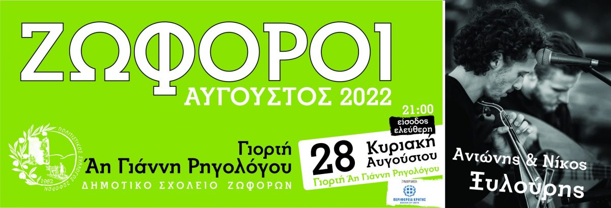 Ο Πολιτιστικός Σύλλογος Ζωφόρων μετά από δύο χρόνια που ο κορονοϊός μας στέρησε την διασκέδαση, θα πραγματοποιήσει σε συνεργασία με την Περιφέρεια Κρήτης, το καθιερωμένο μεγάλο κρητικό γλέντι στην αυλή του Δημοτικού Σχολείου Ζωφόρων, με παραδοσιακό ψητό στον ξυλόφουρνο, πλούσια δώρα, πολύ κέφι και χορό, με το συγκρότημα του Αντώνη και Νίκου Ξυλούρη.