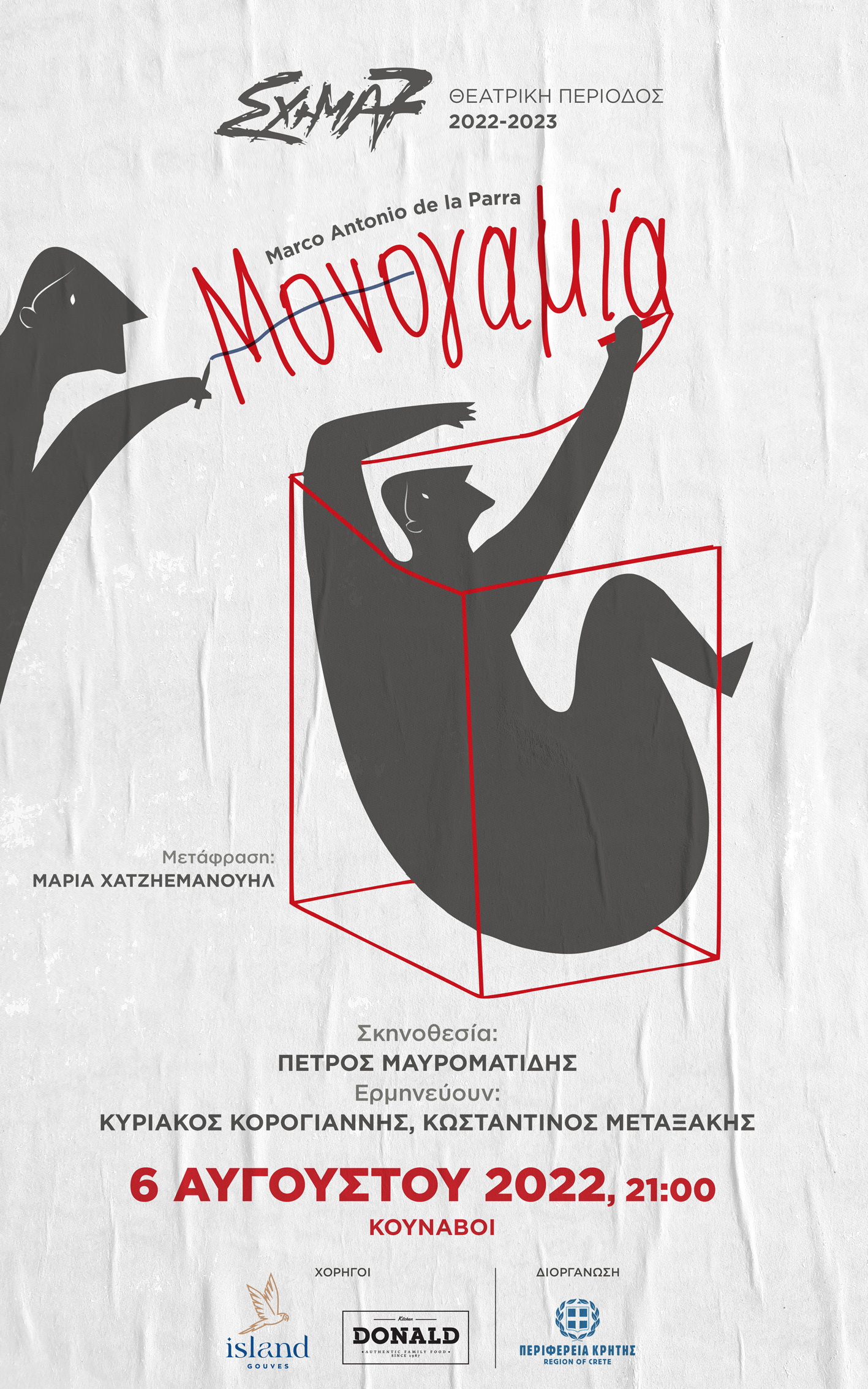 Το ΣΧΗΜΑ 7 παρουσιάζει τη «ΜΟΝΟΓΑΜΙΑ», του Μάρκο Αντόνιο ντε λα Πάρα. Με την στήριξη της Περιφέρειας Κρήτης θα δοθούν τρείς θεατρικές παραστάσεις στις 30 Ιουλίου στον Σάρχο, στις 6 Αυγούστου στους Κουνάβους και στις 7 Αυγούστου στον Πατσίδερο στα πλαίσια του ενδέκατου υποέργου του έργου με τίτλο «διοργάνωση και συνδιοργάνωση πολιτιστικών εκδηλώσεων έτους 2022»