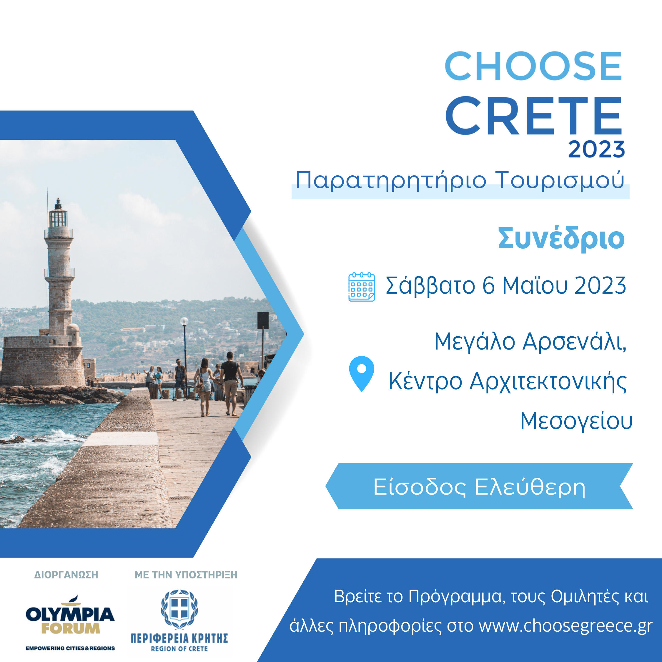 Το Choose Crete, υπό την Αιγίδα του Υπουργείου Τουρισμού, του ΕΟΤ και με την υποστήριξη της Περιφέρειας Κρήτης, θα πραγματοποιηθεί το Σάββατο 6 Μαΐου στις 10:30 π.μ. στο Μεγάλο Αρσενάλι, Κέντρο Αρχιτεκτονικής Μεσογείου στην πόλη των Χανίων, με θέμα “Hospitality in Crete: Extending the Tourist season | Over tourism and Sustainability”.