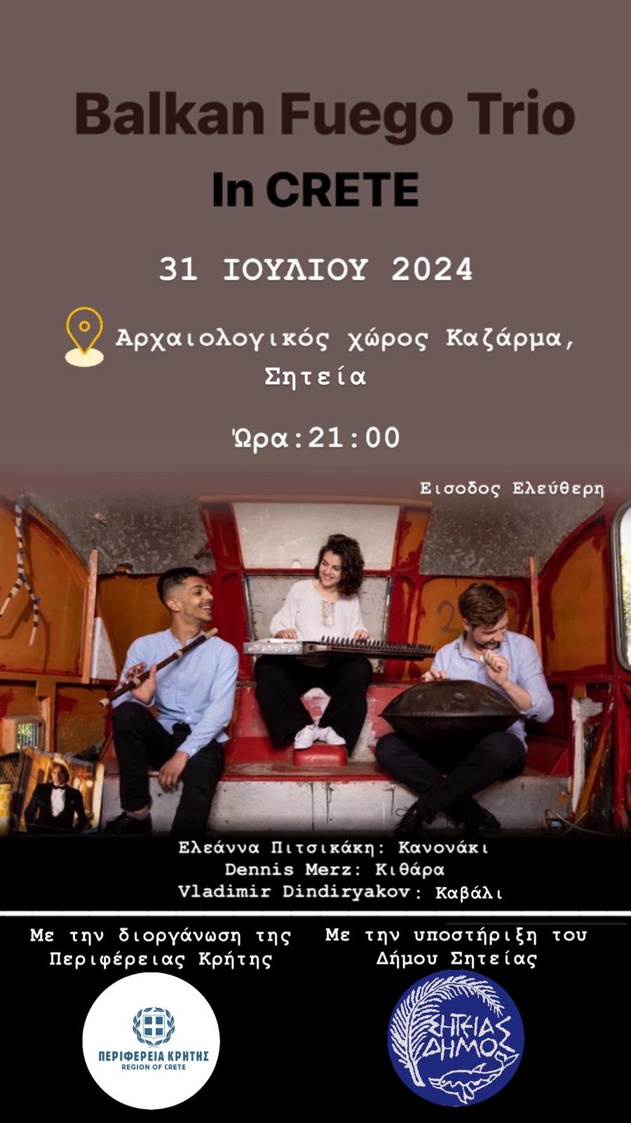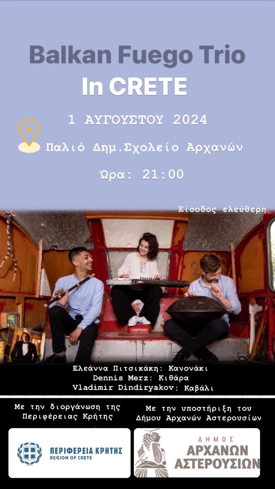 Το BALKAN FUEGO TRIO θα βρίσκεται στις 31 Ιουλίου και ώρα 21.00 στον αρχαιολογικό χώρο Καζάρμα στη Σητεία για μια συναυλία με ελεύθερη είσοδο. Την επόμενη μέρα, 1 Αυγούστου ώρα 21.00 θα βρεθεί στο παλιό δημοτικό σχολείο Αρχανών για τη δεύτερη συναυλία (ελεύθερη είσδος) και στις 3 Αυγούστου και ώρα 21.00 στη Πύλη Βηθλεέμ στο Ηράκλειο για την Τρίτη και τελευταία συναυλία, επίσης με ελεύθερη είσοδο.