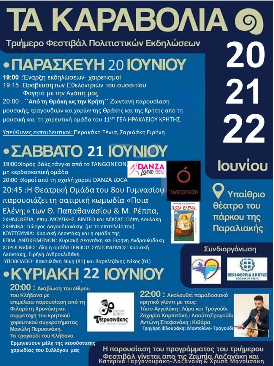 Ο Πολιτιστικός Σύλλογος Καμινίων, διοργανώνει, με την υποστήριξη της Περιφέρειας Κρήτης,  τριήμερο φεστιβάλ «Τα Καραβόλια», από σήμερα Παρασκευή 20 Ιουνίου έως και την Κυριακή 22 Ιουνίου 2025, στο υπαίθριο θέατρο της Παραλιακής, στο πάρκο δίπλα στη θάλασσα στον Καράβολα, με ελεύθερη είσοδο για το κοινό.