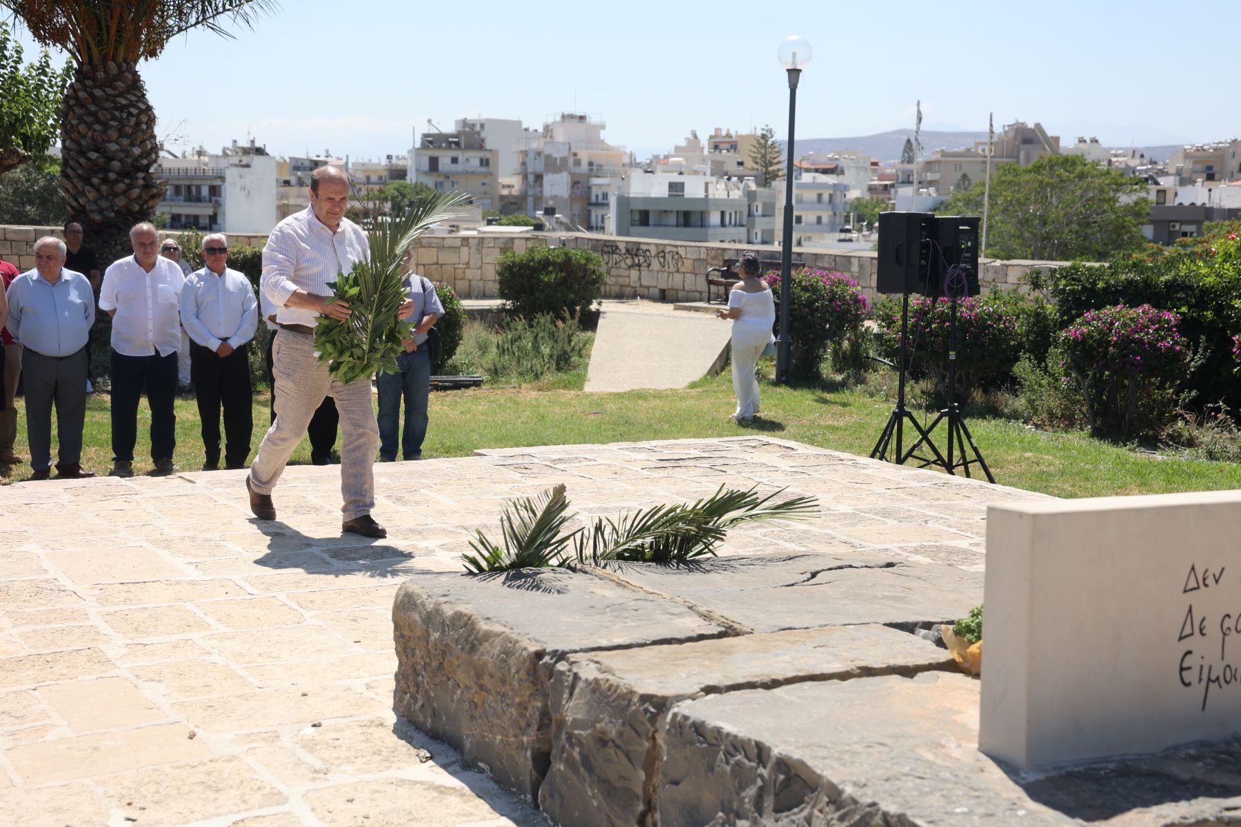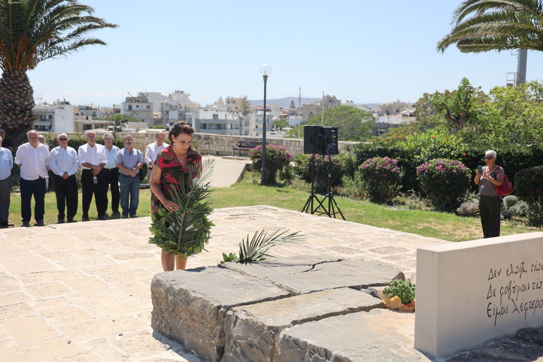 Αμέσως μετά στεφάνια κατέθεσαν οι : Αντιπεριφερειάρχες Γωγώ Μηλάκη και Νίκος Ξυλούρης που εκπροσώπησαν τον Περιφερειάρχη Κρήτης Σταύρο Αρναουτάκη, Αντιδήμαρχος Ηρακλείου Ρένα Παπαδάκη που εκπροσώπησε τον Δήμαρχο Αλέξη Καλοκαιρινό, Αντιδήμαρχος Χερσονήσου Τηλέμαχος Ροδιτάκης που εκπροσώπησε τον Δήμαρχο Ζαχαρία Δοξαστάκη, Πρόεδρος της Ένωσης Συντακτών Ημερησίων Εφημερίδων Πελοποννήσου Ηπείρου και Νήσων Κυριάκος Κορτέσης, Έφορος της Πανελλήνιας Ομοσπονδίας Ενώσεων Συντακτών Κώστας Βασιλάκης, Πρόεδρος της Ένωσης Συντακτών Θεσσαλίας Στερεάς Ελλάδας και Εύβοιας Δημήτρης Χορταργιάς Πρόεδρος του Οργανισμού Πολιτισμού και Ανάπτυξης Ποταμιών η «Γκουβερνιώτισσα» Μανόλης Αργυράκης. Στο τέλος τηρήθηκε ενός λεπτού σιγής στη μνήμη του Κρητικού συγγραφέα.