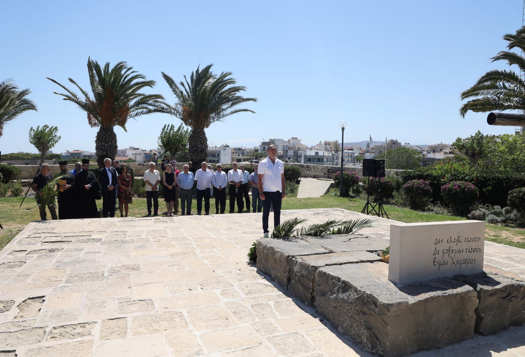 Το τρισάγιο στο τάφο του Ν. Καζαντζάκη τέλεσαν ο εκπρόσωπος του Αρχιεπισκόπου Κρήτης κ. Ευγενίου, Αρχιμανδρίτης Κορνήλιος Αθανασάκης και ο προϊστάμενος του Ιερού Μητροπολιτικού Ναού του Αγ. Μηνά π. Γεώργιος Χανιωτάκης.